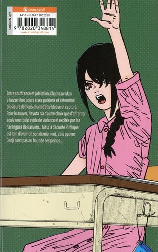 Entre souffrance et jubilation, Chainsaw Man a laissé libre cours à ses pulsions et exterminé plusieurs démons avant d'être blessé et capturé, Pour le sauver, Nayuta : n'a d'autre choix que d'affronter seule une foule avide de violence et excitée parles harangues de Baruem... Mais la Sécurité Publique est loin d'avoir dit son dernier mot, et le pauvre Denji n'est pas au bout de ses peines...