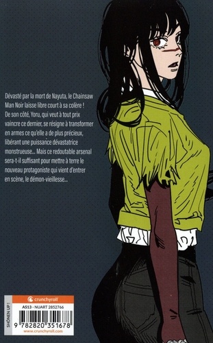 Dévasté par la mort de Nayuta, le Chainsaw Man Noir laisse libre court à sa colère ! De son côté, Yoru, qui veut à tout prix vaincre ce dernier, se résigne à transformer en armes ce qu'elle a de plus précieux, libérant une puissance dévastatrice monstrueuse... Mais ce redoutable arsenal sera-t-il suffisant pour mettre à terre le nouveau protagoniste qui vient d'entrer en scène, le démon-vieillesse...