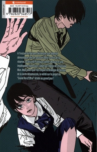 A l'instant où Baruem déclenche son attentat démoniaque afin de pousser Denji à sortir de sa réserve, la Sécurité Publique contre-attaque et une impitoyable répression s'abat sur l'église de Chainsaw Man. Mais alors que l'on croyait la stratégie de la terreur de la secte désamorcée, la vérité sur le projet du "Grand Roi d'Effroi" éclate au grand jour !