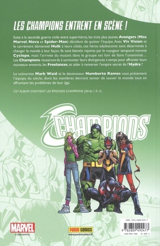 Les champions entrent en scene ! Suite à la seconde guerre civile entre super-héros, les trois plus jeunes Avengers (Miss Marvel, Nova et Spider-Man) décident de quitter l'équipe. Avec Viv Vision et le carrément démentiel Hulk à leurs côtés, ces héros adolescents sont déterminés changer le monde à leur façon. Ils sont bientôt rejoints par le voyageur temporel nommé Cyclope, mais l'arrivée du mutant dans le groupe est loin de faire l'unanimité... Les Champions réussiront-ils à surmonter leurs divergences à temps pour affronter leurs nouveaux ennemis, les Freelances, et aider à renverser l'empire secret de l'Hydra ? Le scénariste Mark Waid et le dessinateur Humberto Ramos vous présentent l'équipe du siècle, dont les membres devront tenter de sauver le monde tout en affrontant les problèmes de leur âge.