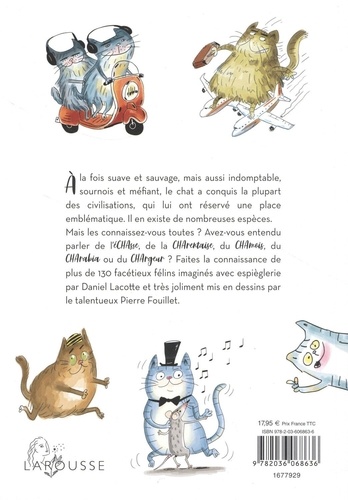 A la fois suave et sauvage, mais aussi indomptable, sournois et méfiant, le chat a conquis la plupart des civilisations, qui lui ont réservé une place emblématique. Il en existe de nombreuses espèces. Mais les connaissez-vous toutes ? Avez-vous entendu parler de l'éCHAsse, de la CHArentaise, du CHAmois, du CHArabia ou du CHArgeur ? Faites la connaissance de plus de 130 facétieux félins imaginés avec espièglerie par Daniel Lacotte et très joliment mis en dessins par le talentueux Pierre Fouillet.