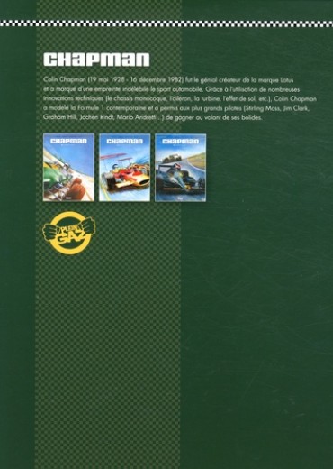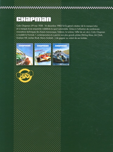 Avec un dessin classique et réaliste dans la plus pure tradition de l'école Michel Vaillant, cette série de la collection Plein Gaz retrace l'histoire de la marque Lotus, évoquant les moments importants qui ont jalonné son existence : ses grands succès, mais aussi ses drames... Elle tend surtout à montrer que son génial inventeur, Colin Chapman, a toujours été animé par une seule et même passion : le défi de l'innovation. Retrouvez l'histoire complète en trois tomes de Chapman dans ce coffret, cadeau idéal de fin d'année pour les férus d'automobile.