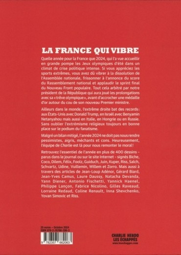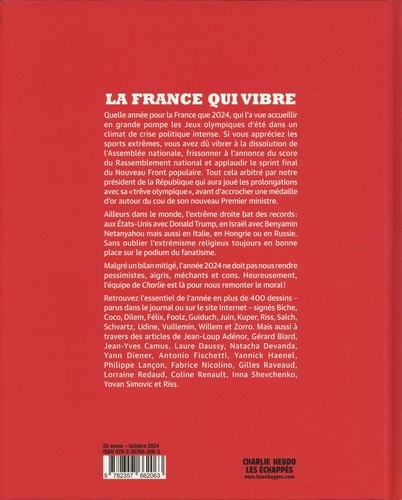 Quelle année pour la France que 2024, qui l'a vue accueillir en grande pompe les Jeux olympiques d'été dans un climat de crise politique intense. Si vous appréciez les sports extrêmes, vous avez dû vibrer à la dissolution de l'Assemblée nationale, frissonner à l'annonce du score du Rassemblement national et applaudir le sprint final du Nouveau Front populaire. Tout cela arbitré par notre président de la République qui aura joué les prolongations avec sa "trêve olympique", avant d'accrocher une médaille d'or autour du cou de son nouveau Premier ministre. Ailleurs dans le monde, l'extrême droite bat des records : aux Etats-Unis avec Donald Trump, en Israël avec Benyamin Netanyahou mais aussi en Italie, en Hongrie ou en Russie. Sans oublier l'extrémisme religieux toujours en bonne place sur le podium du fanatisme. Malgré un bilan mitigé, l'année 2024 ne doit pas nous rendre pessimistes, aigris, méchants et cons. Heureusement, l'équipe de Charlie est là pour nous remonter le moral ! Retrouvez l'essentiel de l'année en plus de 400 dessins - parus dans le journal ou sur le site Internet - signés Biche, Coco, Dilem, Félix, Foolz, Guiduch, Juin, Kuper, Riss, Salch, Schvartz, Udine, Vuillemin, Willem et Zorro. Mais aussi à travers des articles de Jean-Loup Adénor, Gérard Biard, Jean-Yves Camus, Laure Daussy, Natacha Devanda, Yann Diener, Antonio Fischetti, Yannick Haenel, Philippe Lançon, Fabrice Nicolino, Gilles Raveaud, Lorraine Redaud, Coline Renault, Inna Shevchenko, Yovan Simovic et Riss.