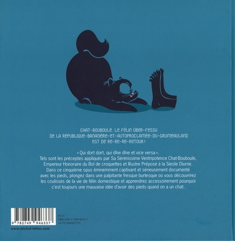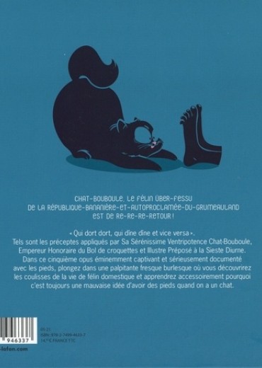 Le Chat-Bouboule revient en force ! Chat-bouboule, le félin über-fessu de la République-bananière-et-autoproclamée-du-Grumeauland est de re-re-re-retour ! "Qui dort dort, qui dîne dîne et vice versa". Tels sont les préceptes appliqués par Sa Sérénissime Ventripotence Chat-bouboule, Empereur Honoraire du Bol de croquettes et Illustre Préposé à la Sieste Diurne. Dans ce cinquième opus éminemment captivant et sérieusement documenté avec les pieds, plongez dans une palpitante fresque burlesque où vous découvrirez les coulisses de la vie de félin domestique et apprendrez accessoirement pourquoi c'est toujours une mauvaise idée d'avoir des pieds quand on a un chat.