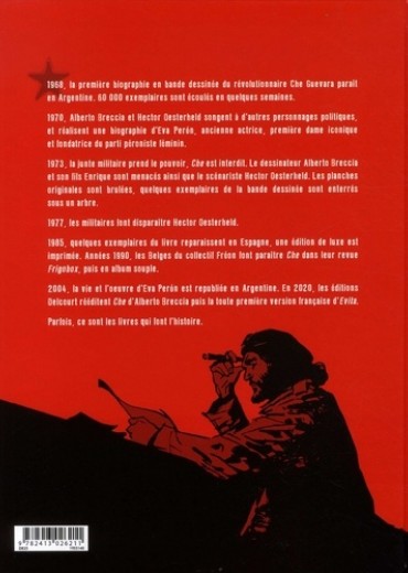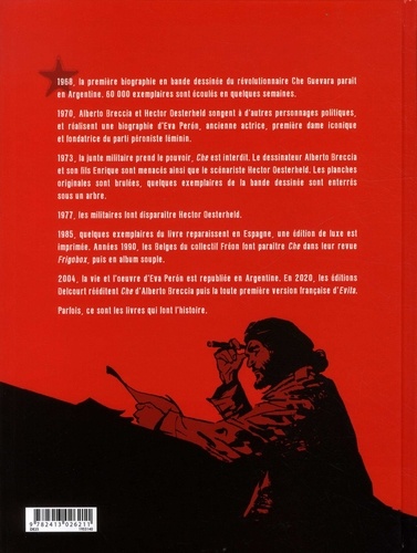 1968, la première biographie en bande dessinée du révolutionnaire Che Guevara parait en Argentine. 60 000 exemplaires sont écoulés en quelques semaines. 1970, Alberta Breccia et Hector Oesterheld songent a d'autres personnages politiques, et réalisent une biographie d'Eva Perón, ancienne actrice. première dame iconique et fondatrice du parti péroniste féminin. 1973, la junte militaire prend le pouvoir, Che est interdit. Le dessinateur Alberto Breccia et son fils Enrique sont menacés ainsi que le scénariste Hector Oesterheld. Les planches originales sont brulées, quelques exemplaires de la bande dessinée sont enterrés sous un arbre. 1977, les militaires font disparaitre Hector Oesterheld. 1985, quelques exemplaires du livre reparaissent en Espagne, une édition de luxe est imprimée. Années 1990, les Belges du collectif Fréon font paraitre Che dans leur revue Frigobox, puis en album souple. 2004, la vie et l'oeuvre d'Eva Perón est republiée en Argentine. En 2020. les éditions Delcourt rééditent Che d'Alberto Breccia puis la toute première version française d'Evita. Parfois, ce sont les livres qui font l'histoire.