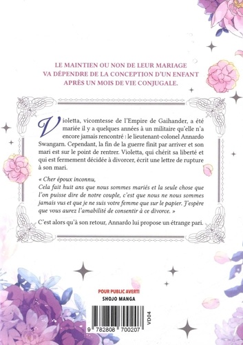 Violetta, vicomtesse de l'empire de Gaihander, est une femme de grand talent commercial et militaire. Elle est mariée depuis huit ans à un homme qu'elle n'a jamais vu, le lieutenant-colonel Annardo, qu'on prétend aussi beau qu'impitoyable. Mais lorsque la guerre prend fin, son mari rentre au pays. Violetta, heureuse de sa vie libre actuelle, écrit alors une lettre à Annardo pour lui demander le divorce. Son mari n'accepte qu'à une condition ? : qu'elle réussisse à tenir le pari de ne pas tomber enceinte dans le mois.