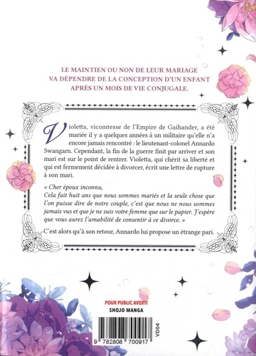 Violetta, vicomtesse de l'empire de Gaihander, est une femme de grand talent commercial et militaire. Elle est mariée depuis huit ans à un homme qu'elle n'a jamais vu, le lieutenant-colonel Annardo, qu'on prétend aussi beau qu'impitoyable. Mais lorsque la guerre prend fin, son mari rentre au pays. Violetta, heureuse de sa vie libre actuelle, écrit alors une lettre à Annardo pour lui demander le divorce. Son mari n'accepte qu'à une condition ? : qu'elle réussisse à tenir le pari de ne pas tomber enceinte dans le mois.