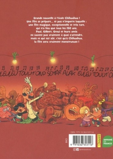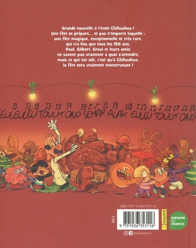 Grande nouvelle à l'école Chihuahua ! Une fête se prépare... et pas n'importe laquelle : une fête magique, exceptionnelle et très rare, qui n'a lieu que tous les 150 ans. Paul, Gilbert, Groui et leurs amis ne savent pas vraiment à quoi s'attendre, mais ce qui est sûr, c'est qu'à Chihuahua, la fête sera vraiment monstrueuse !