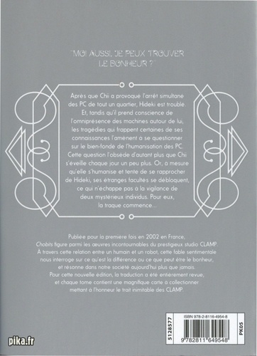 Après que Chii a provoqué l'arrêt simultané des PC de tout un quartier, Hideki est troublé. Et, tandis qu'il prend conscience de l'omniprésence des machines autour de lui, les tragédies qui frappent certaines de ses connaissances l'amènent à se questionner sur le bien-fondé de l'humanisation des PC. Cette question l'obsède d'autant plus que Chii s'éveille chaque jour un peu plus. Or, à mesure qu'elle s'humanise et tente de se rapprocher de Hideki, ses étranges facultés se débloquent, ce qui n'échappe pas à la vigilance de deux mystérieux individus. Pour eux, la traque commence... Publiée pour la première fois en 2002 en France, Chobits figure parmi les oeuvres incontournables du prestigieux studio CLAMP. A travers cette relation entre un humain et un robot, cette fable sentimentale nous interroge sur ce qu'est la différence ou ce que peut être le bonheur, et résonne dans notre société aujourd'hui plus que jamais. Pour cette nouvelle édition, la traduction a été entièrement revue, et chaque tome contient une magnifique carte a collectionner mettant à l'honneur le trait inimitable des CLAMP.