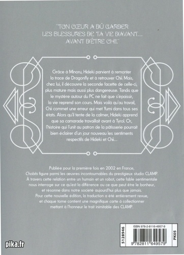 Grâce à Minoru, Hideki parvient à remonter la trace de Dragonfly et à retrouver Chii. Mais, chez lui, il découvre la seconde facette de celle-ci, plus mature mais aussi plus dangereuse. Tandis que le mystère autour du PC ne fait que s'épaissir, la vie reprend son cours. Mais voilà qu'au travail, Chii commet une erreur qui met Yumi dans tous ses états. Alors qu'il tente de la calmer, Hideki apprend que sa camarade travaillait avant à Tyrol. Or, l'histoire qui l'unit au patron de la pâtisserie pourrait bien éclairer d'un jour nouveau les sentiments respectifs de Hideki et Chii... Publiée pour la première fois en 2002 en France, Chobits figure parmi les oeuvres incontournables du prestigieux studio CLAMP. A travers cette relation entre un humain et un robot, cette fable sentimentale nous interroge sur ce qu'est la différence ou ce que peut être le bonheur, et résonne dans notre société aujourd'hui plus que jamais. Pour cette nouvelle édition, la traduction a été entièrement revue, et chaque tome contient une magnifique carte à collectionner mettant à l'honneur le trait inimitable des CLAMP.