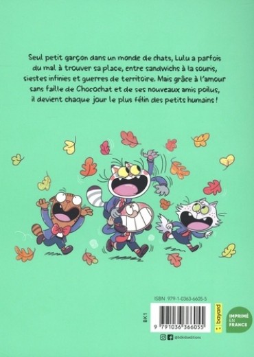 Chocochat et sa famille ont accueilli Lulu au sein de leur foyer avec joie, amour et douceur. Malgré tout, le petit humain adopté a encore du mal à trouver complètement sa place dans ce monde de chats et à en comprendre tous les codes. Aimera-t-il un jour les sandwichs à la souris ? Sera-t-il capable de faire quatre siestes par après-midi ? Saura-t-il grimper aux arbres, attraper des pelotes de laine, lézarder au soleil des heures durant ? Aura-t-il son propre territoire ? Aimera-t-il un jour les cartons vides autant que ses nouveaux camarades ? Une chose est sûre cependant, c'est qu'il peut compter sur le soutien sans faille de ses amis poilus pour l'aider à s'adapter. Car si Lulu n'est pas encore un chat comme les autres, il devient chaque jour à leur côté le plus félin des petits humains !