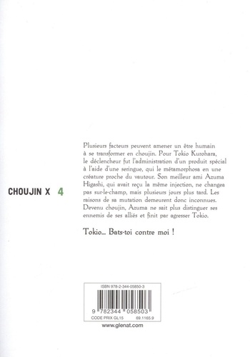 Plusieurs facteurs peuvent amener un être humain à se transformer en choujin. Pour Tokio Kurohara, le déclencheur fut l'administration d'un produit spécial à l'aide d'une seringue, qui le métamorphosa en une créature proche du vautour. Son meilleur ami Azuma Higashi, aui avait reçu la même injection, ne changea pas sur-le-champ, mais plusieurs jours plus tard. Les raisons de sa mutation demeurent donc inconnues. Devenu choujin, Azuma ne sait plus distinguer ses ennemis de ses alliés et finit par agresser Tokio.