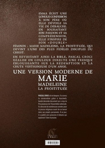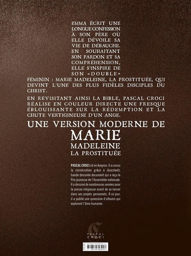 Emma écrit une longue confession à son père. Elle y dévoile sa double vie : journaliste le jour, et actrice érotique, la nuit. Elle ne souhaite qu'une chose, la compréhension et le pardon. Son modèle : Marie-Madeleine, la prostituée, qui devint l'une des plus fidèles "disciples" du Christ. Pascal Croci revisite la Bible en proposant une version moderne de Marie Madeleine, la prostituée...
