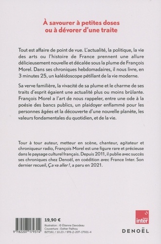 A savourer à petites doses ou à dévorer d'une traite. Tout est affaire de point de vue. L'actualité, la politique, la vie des arts ou l'histoire de France prennent une allure délicieusement nouvelle et décalée sous la plume de François Morel. Dans ses chroniques hebdomadaires, il nous livre, en 3 minutes 25, un kaléidoscope pétillant de la vie moderne. Sa verve familière, la vivacité de sa plume et le charme de ses traits d'esprit égaient une actualité plus ou moins brûlante. François Morel a l'art de nous rappeler, entre une ode à la poésie des bancs publics, un plaidoyer enflammé pour les personnes âgées et la découverte d'une nouvelle planète, les valeurs fondamentales du quotidien, et de la vie.