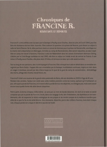 Quand la BD frôle les frontières de l'intime... Francine R. est arrêtée avec sa soeur par la Gestapo à Pouilly-sous-Charlieu, dans la Loire, le 6 avril 1944, pour les faits de résistance de leur frère Joannès. De là, elles partiront dans un convoi de femmes puis elles seront séparées : sa soeur expédiée en camps de travail à Hanovre ; Francine à celui de Wattenstedt dans les usines d'armement Herman Göring. Tout au long de son parcours, rien ne lui sera épargné : frappes dès son arrestation par la Gestapo, humiliations continues, trajets en train dans un wagon à bestiaux, accueil par des chiens loups sur le quai de la gare du camp de concentration, expérience médicale, déshabillage des morts, pillage des vivants, travail forcé... Mais aussi, la permanence de l'espoir de sortir vivant de cet enfer, la lumière de deux hommes, un français et un algérien croisés à Wattenstedt, le sabotage du travail à la chaine, l'émotion à la libération du camp, la première nuit dans un vrai lit, le 14 juillet de la libération à Paris. Francine a évoqué tout cela en détail à Boris Golzio dans un long entretien. Longtemps resté avec cette matière entre les mains, l'auteur décide aujourd'hui de retranscrire cette parole dans un récit de bande dessinée dont le dessin se fait le plus neutre et naïf possible afin de rendre l'horreur supportable. Un récit où le texte n'est composé que par la voix de Francine, dans son langage à elle, brut, fait d'hésitations, de répétitions et de tremblements, afin de respecter la vérité ontologique de ses propos et de rendre compte de la meilleure manière possible ce que fut la vie de cette femme. Une résistante, déportée, parmi des milliers d'autres, mais dont chaque voix, chaque parole est unique et doit être sauvée de l'oubli.