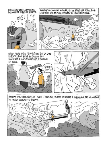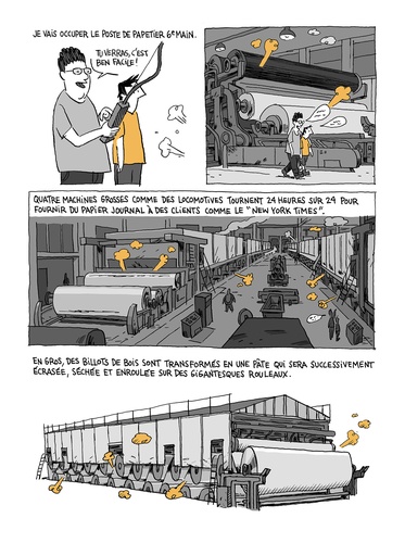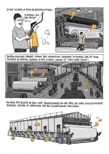 Vous ne le saviez peut-être pas mais avant d'être un célèbre auteur de bandes dessinées, le jeune étudiant Guy Delisle a travaillé trois étés dans une usine à papier. A partir de cette expérience de jeunesse, il dresse un portrait drôle et tendre du monde du travail et questionne les relations qu'il entretient avec son père, lui-même salarié dans l'usine.