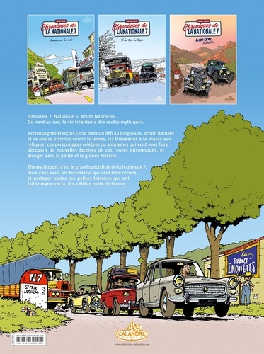 Nationale 7, Nationale 6, Route Napoléon... Du nord au sud, la vie trépidante des routes mythiques. Accompagnez François Lecot dans un défi au long cours, Woolf Barnato et sa course effrénée contre le temps, les Dieudonné à la chasse aux reliques ; ces personnages célèbres ou anonymes qui vont vous faire découvrir de nouvelles facettes de ces routes pittoresques, et plonger dans la petite et la grande histoire. Thierry Dubois, c'est le grand spécialiste de la Nationale 7, mais c'est aussi un dessinateur qui veut faire revivre et partager toutes ces petites histoires qui on fait le mythe de la plus célèbre route de France.