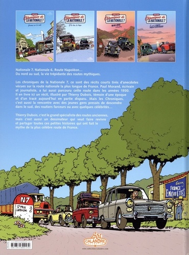 Les chroniques de la Nationale 7, ce sont des récits courts tirés d'anecdotes vécues sur la route nationale la plus longue de France. Paul Morand, écrivain et journaliste, a lui aussi parcouru cette route dans les années 1930. Il en livre ici un récit, illustré par Thierry Dubois, témoin d'une époque et d'un tracé aujourd'hui en partie disparu. Mais les Chroniques, c'est aussi la rencontre avec des jeunes gens pressés de descendre dans le sud ou quelques gendarmes vigilants... La Nationale 7, un patrimoine routier qui n'a pas fini de nous surprendre.