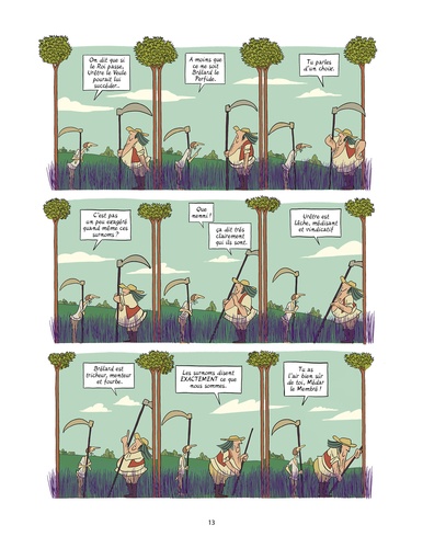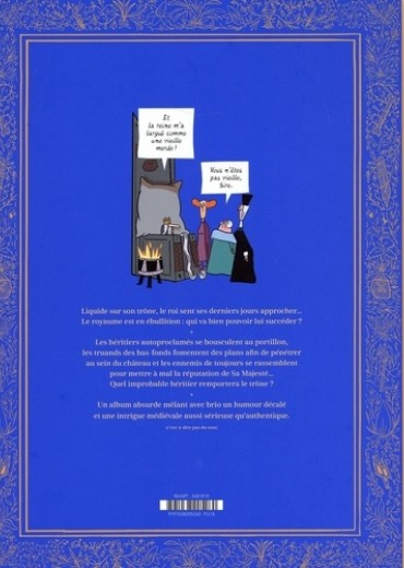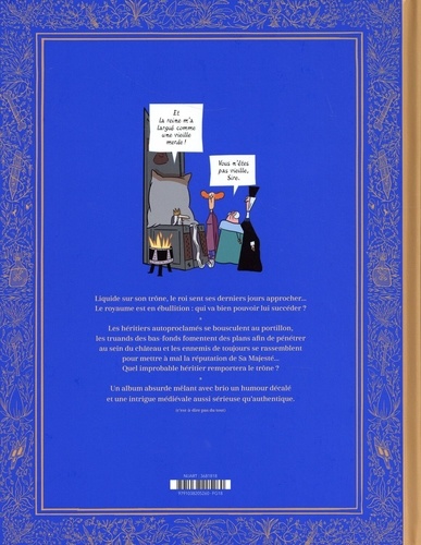 Liquide sur son tro ne, le roi sent ses derniers jours approcher... Le royaume est en e bullition : qui va bien pouvoir lui succe der ? Un album absurde me lant avec brio un humour de cale et une intrigue me die vale aussi se rieuse qu'authentique. (c'est-a -dire pas du tout) Les he ritiers autoproclame s se bousculent au portillon, les truands des bas-fonds fomentent des plans afin de pe ne trer au sein du cha teau et les ennemis de toujours se rassemblent pour mettre a mal la re putation de Sa Majeste ... Quel improbable he ritier remportera le tro ne ?