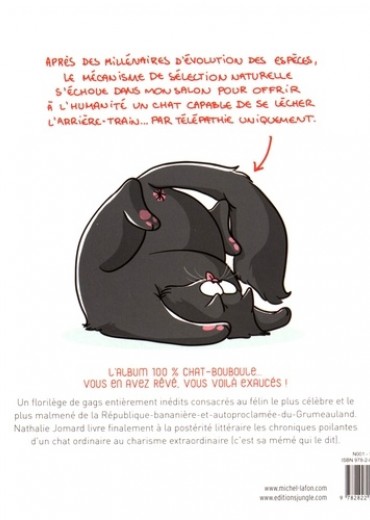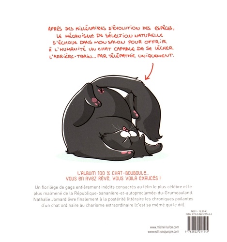 Après des millénaires d'évolution des espèces, le mécanisme de sélection naturelle s'échoue dans mon salon pour offrir à l'humanité un chat capable de se lècher l'arrière-train... Par télépathie uniquement. L'album 100 % chat-bouboule... Vous en avez rêvé, vous voilà exaucés ! Un florilège de gags entièrement inédits consacrés au félin le plus célèbre et le plus malmené de la République-bananière-et-autoproclamée-du-Grumeauland. Nathalie Jomard livre finalement à la postérité littéraire les chroniques poilantes d'un chat ordinaire au charisme extraordinaire (c'est sa mémé qui le dit).