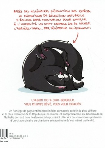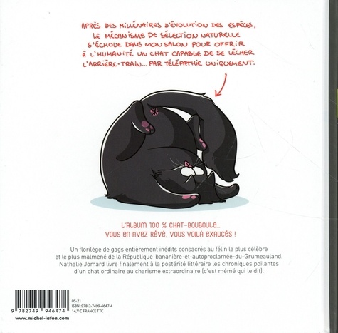 L'album 100% chat-bouboule ... Vous en avez rêvé, vous voilà exaucés ! Après des millénaires d'évolution des espèces, le mécanisme de sélection naturelle s'échoue dans mon salon pour offrir à l'humanité un chat capable de se lécher l'arrière-train ... par télépathie uniquement. Un florilège de gags entièrement inédits consacrés au félin le plus célèbre et le plus malmené de la République-bananière-et-autoproclamée-du-Grumeauland. Nathalie Jomard livre finalement à la postérité littéraire les chroniques poilantes d'un chat ordinaire au charisme extraordinaire (c'est mémé qui le dit).