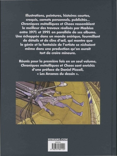 Illustrations, peintures, histoires courtes, croquis, carnets personnels, publicités... Chroniques métalliques et Chaos rassemblent le meilleur des travaux réalisés par Moebius entre 1971 et 1991 en parallèle de ses albums. Une échappée dans un monde onirique, fourmillant de détails et de clins d'oeil, qui montre que le génie et la fantaisie de l'artiste se nichaient même dans une production qu'on aurait tort de croire mineure. Réunis pour la première fois en un seul volume, Chroniques métalliques et Chaos sont enrichis d'une préface de Daniel Pizzoli, "Les Arcanes du dessin".
