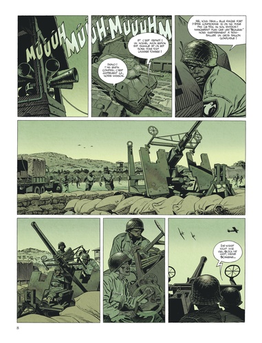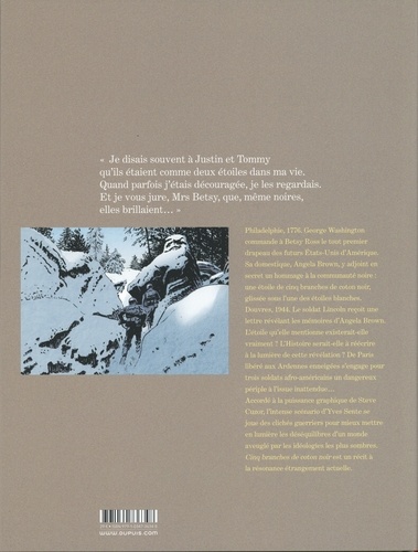 Philadelphie, 1776. George Washington commande à Betsy Ross le tout premier drapeau des futurs Etats-Unis d'Amérique. Sa domestique, Angela Brown, y adjoint en secret un hommage à la communauté noire : une étoile de cinq branches de coton noir, glissée sous l'une des étoiles blanches. Douvres, 1944. Le soldat Lincoln reçoit une lettre révélant les mémoires d'Angela Brown. L'étoile qu'elle mentionne existerait-elle vraiment ? L'Histoire serait-elle à réécrire à la lumière de cette révélation ? De Paris libéré aux Ardennes enneigées s'engage pour trois soldats afro-américains un dangereux périple à l'issue inattendue... Accordé à la puissance graphique de Steve Cuzor, l'intense scénario d'Yves Sente se joue des clichés guerriers pour mieux mettre en lumière les déséquilibres d'un monde aveuglé par les idéologies les plus sombres. Cinq branches de coton noir est un récit à la résonance étrangement actuelle.