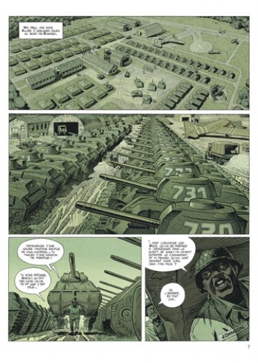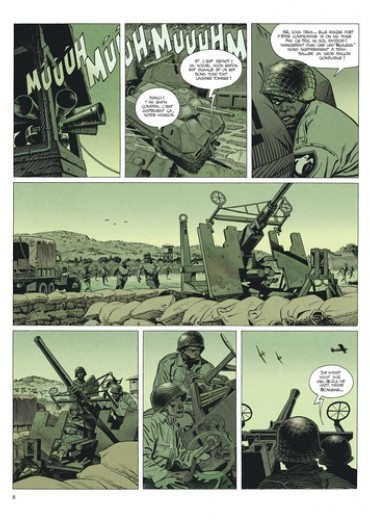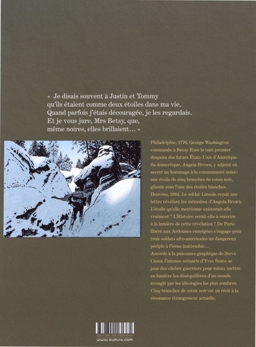 Philadelphie, 1776. George Washington commande à Betsy Ross le tout premier drapeau des futurs Etats-Unis d'Amérique. Sa domestique, Angela Brown, y adjoint en secret un hommage à la communauté noire : une étoile de cinq branches de coton noir, glissée sous l'une des étoiles blanches. Douvres, 1944. Le soldat Lincoln reçoit une lettre révélant les mémoires d'Angela Brown. L'étoile qu'elle mentionne existerait-elle vraiment ? L'Histoire serait-elle à réécrire à la lumière de cette révélation ? De Paris libéré aux Ardennes enneigées s'engage pour trois soldats afro-américains un dangereux périple à l'issue inattendue... Accordé à la puissance graphique de Steve Cuzor, l'intense scénario d'Yves Sente se joue des clichés guerriers pour mieux mettre en lumière les déséquilibres d'un monde aveuglé par les idéologies les plus sombres. Cinq branches de coton noir est un récit à la résonance étrangement actuelle.
