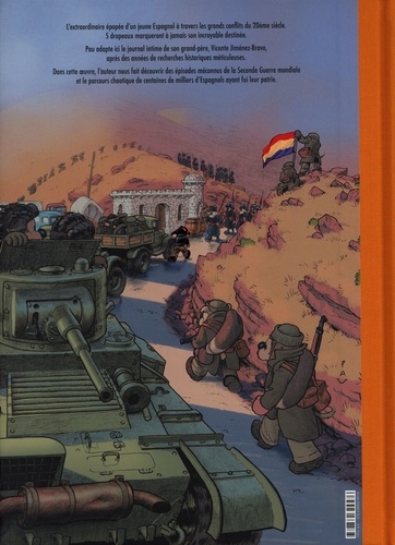 L'extraordinaire épopée d'un jeune Espagnol à travers les grands conflits du 20ème siècle. 5 drapeaux marqueront à jamais son incroyable destinée. Pau adapte ici le journal intime de son grand-père, Vicente Jiménez-Bravo, après des années de recherches historiques méticuleuses. Dans cette oeuvre, l'auteur nous fait découvrir des épisodes méconnus de la Seconde Guerre mondiale et le parcours chaotique de centaines de milliers d'Espagnols ayant fui leur patrie.