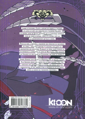 Lassé d'attendre, Clenn a décidé de passer à l'attaque et lance un défi aux sorciers de l'académie Solsein. Il espère aussi qu'Alicia profitera de la confusion générale pour se tirer d'affaire, même s'il ignore tout de la transformation qu'elle a subie. Pour sa part, l'héroïne a triomphé des épreuves du roi-démon du nord... mais pour obtenir un pouvoir, elle doit lui abandonner ses souvenirs. Flairant le piège, elle s'enfuit et se retrouve à combattre au côté de Rod Loyce. Des soldats de Voldeen ou des alliés de Clevatess, qui aura le dessus ? Après Darker than Black et Dimension W, le roi de l'action Yuji Iwahara rebat les cartes de la dark fantasy ! Ici, une créature des ténèbres mène la danse, les héros sont des marionnettes, et nul trésor n'est à espérer en fin de quête. Juste la survie de l'humanité, peut-être...
