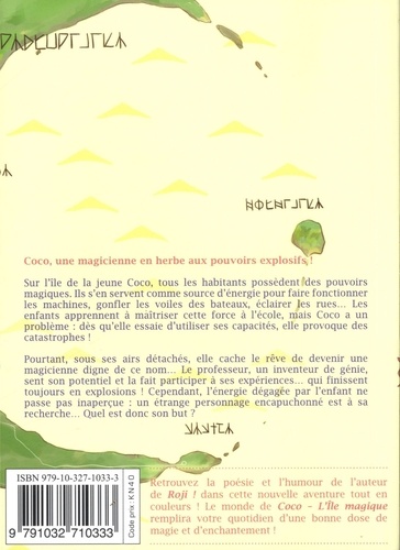 Coco, une magicienne en herbe aux pouvoirs explosifs ! Sur l'île de la jeune Coco, tous les habitants possèdent des pouvoirs magiques. Ils s'en servent comme source d'énergie pour faire fonctionner les machines, gonfler les voiles des bateaux, éclairer les rues... Les enfants apprennent à maîtriser cette force à l'école, mais Coco a un problème : dès qu'elle essaie d'utiliser ses capacités, elle provoque des catastrophes ! Pourtant, sous ses airs détachés, elle cache le rêve de devenir une magicienne digne de ce nom... Le professeur, un inventeur de génie, sent son potentiel et la fait participer à ses expériences... qui finissent toujours en explosions ! Cependant, l'énergie dégagée par l'enfant ne passe pas inaperc ? ue : un étrange personnage encapuchonné est à sa recherche... Quel est donc son but ? Retrouvez la poésie et l'humour de l'auteur de Roji ! dans cette nouvelle aventure tout en couleurs ! Le monde de Coco - L'Ile magique remplira votre quotidien d'une bonne dose de magie et d'enchantement !