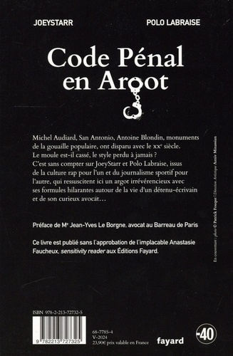 Michel Audiard, San Antonio, Antoine Blondin, monuments de la gouaille populaire, ont disparu avec le XXe siècle. Le moule est-il cassé, le style perdu à jamais ? C'est sans compter sur JoeyStarr et Polo Labraise, issus de la culture rap pour l'un et du journalisme sportif pour l'autre, qui ressuscitent ici un argot irrévérencieux avec ses formules hilarantes autour de la vie d'un détenu-écrivain et de son curieux avocat... Préface de Me Jean-Yves Le Borgne, avocat au Barreau de Paris. Ce livre est publié sans l'approbation de l'implacable Anastasie Faucheux, sensitivity reader aux Editions Fayard.