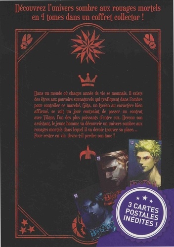 Découvrez l'univers sombre aux rouages mortels en 4 tomes dans un coffret collector ! Dans un monde où chaque année de vie se monnaie, il existe des êtres aux pouvoirs surnaturels qui trafiquent dans l'ombre pour contrôler ce marché. Gôta, un lycéen au caractère bien affirmé, se voit un jour contraint de passer un contrat avec Viktor, l'un des plus puissants d'entre eux. Devenu son assistant, le jeune homme va découvrir un univers sombre aux rouages mortels dans lequel il va devoir trouver sa place... Pour rester en vie, devra-t-il perdre son âme ?