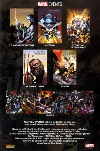 Marvel Events est une collection dédiée aux plus grand évènements de la Maison des Idées. Dans ce coffret à tirage limité, sont regroupées les versions collectors de cinq saga incontournables mettant en scène les X-Men : Le massacre mutant (1986), Inferno (1988), X-Tinction programmée (1990), Old Man Logan (2008) et Schism (2011). Découvrez plus de 1 200 pages réalisées par les plus talentueux auteurs de comics ainsi qu'un poster panoramique signé Marko Djurdjevic.
