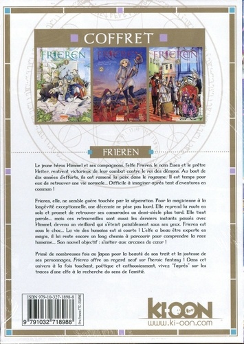 Le jeune héros Himmel et ses compagnons, l'elfe Frieren, le nain Eisen et le prêtre Heiter, rentrent victorieux de leur combat contre le roi des démons. Au bout de dix années d'effort, ils ont ramené la paix dans le royaume. Il est temps pour eux de retrouver une vie normale... Difficile à imaginer après tant d'aventures en commun ! Frieren, elle, ne semble guère touchée par la séparation. Pour la magicienne à la longévité exceptionnelle, une décennie ne pèse pas lourd. Elle reprend la route en solo et promet de retrouver ses camarades un demi-siècle plus tard. Elle tient parole... mais ces retrouvailles sont aussi les derniers instants passés avec Himmel, devenu un vieillard qui s'éteint paisiblement sous ses yeux. Frieren est sous le choc... La vie des humains est si courte ! L'elfe a beau être experte en magie, il lui reste encore un long chemin à parcourir pour comprendre la race humaine... Son nouvel objectif : s'initier aux arcanes du coeur !