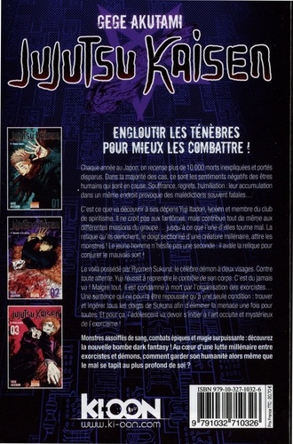 Chaque année au Japon, on recense plus de 10 000 morts inexpliquées et portés disparus. Dans la majorité des cas, ce sont les sentiments négatifs des êtres humains qui sont en cause. Souffrance. regrets. humiliation . leur accumulation dans un même endroit provoque des malédictions souvent fatales... C'est ce que va découvrir à ses dépens Yuji Itadori, lycéen et membre du club de spiritisme. Il ne croit pas aux fantômes. mais contribue tout de même aux différentes missions du groupe jusqu'à ce que l'une d'elles tourne mal. La relique qu'ils dénichent, le doigt sectionné d'une créature millénaire, attire les monstres ! Le jeune homme n'hésite pas une seconde : il avale la relique pour conjurer le mauvais sort ! Le voilà possédé par Ryomen Sukuna. le célèbre démon à deux visages. Contre toute attente. Yuji réussit à reprendre le contrôle de son corps. C'est du jamais vu ! Malgré tout. il est condamné à mort par l'organisation des exorcistes... Une sentence qui ne pourra être repoussée qu'à une seule condition : trouver et ingérer tous les doigts de Sukuna afin d'éliminer la menace une fois pour toutes. Et pour ça. l'adolescent va devoir s'initier à l'art occulte et mystérieux de l'exorcisme ! Monstres assoiffés de sang, combats épiques et magie surpuissante découvrez la nouvelle bombe dark fantasy ! Au coeur d'une lutte millénaire entre exorcistes et démons, comment garder son humanité alors même que le mal se tapit au plus profond de soi ?
