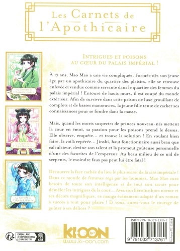 Intrigues et poisons au coeur du palais impérial ! Coffret des trois premiers volumes - Edition 2023 : 1 poster en bonus ! A 17 ans, Mao Mao a une vie compliquée. Formée dès son jeune âge par un apothicaire du quartier des plaisirs, elle se retrouve enlevée et vendue comme servante dans le quartier des femmes du palais impérial ! Entouré de hauts murs, il est coupé du monde extérieur. Afin de survivre dans cette prison de luxe grouillant de complots et de basses manoeuvres, la jeune fille tente de cacher ses connaissances pour se fondre dans la masse. Mais, quand les morts suspectes de princes nouveau-nés mettent la cour en émoi, sa passion pour les poisons prend le dessus. Elle observe, enquête... et trouve la solution ! En voulant bien faire, la voilà repérée... Jinshi, haut fonctionnaire aussi beau que calculateur, devine son talent et la promeut goûteuse personnelle d'une des favorites de l'empereur. Au beau milieu de ce nid de serpents, le moindre faux pas peut lui être fatal ! Découvrez la face cachée du lieu le plus secret de la cité impériale ! Dans ce monde de femmes régi par les hommes, Mao Mao aura besoin de toute son intelligence et de tout son savoir pour démêler les intrigues de la cour... Avec son héroïne hors norme et ses décors magnifiques, ce manga événement adapté d'un roman à succès a tout pour plaire ! Et vous, aurez-vous le courage de goûter à ses délices ?