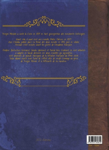 Prosper Mérimée a visité la Corse en 1839 en tant qu'inspecteur historique. Avant cela, il avait écrit une nouvelle, Mattéo Falcone, en 1829. Avec Colomba, publiée dans la Revue des deux mondes en 1840, puis en volume, l'écrivain s'est ensuite ouvert les portes de l'Académie française. Frédéric Bertocchini (Scénario) , Sandro (Dessin) et Pascal Nino (Couleurs) se sont attachés à adapter en bande dessinée ces deux nouvelles qui aujourd'hui sont devenues de grands classiques de la littérature française du 19ème siècle. Deux albums réunis sous forme de coffret afin de rendre hommage au génie de Prosper Mérimée, et à l'efficacité de sa narration.