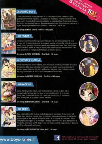 Ce pack manga contient : My Honey ! (160 pages - Volume : One Shot) : Le conseil des élèves se fait espionner ! Hirokuni, vice-président, décide d'en avoir le coeur net, et tire de sa cachette, à sa grande surprise, un adorable élève de première année, Shino, qui avoue être amoureux de la présidente du conseil, Saki. D'un naturel enjoué, Hirokuni décide de venir en aide à Shino pour le pousser à se déclarer à Saki, mais les choses ne vont pas tout à fait dans la direction prévue...Dreaming Love (176 pages - Volume : 1 / 2) : Kanô est amoureux d'un subordonné de sa compagnie, le beau Sawamura, très gentil et extrêmement populaire. Connaissant sa malchance en amour, il est décidé à taire envers et contre tout ses sentiments pour lui, mais au détour d'une soirée arrosée, les choses prennent une tournure drastiquement différente, et Kanô se rend compte qu'il a peut-être pris pendant deux ans Sawamura pour ce qu'il n'était pas...Manazashi Ni Obore Yo Kimi (162 pages - Volume : One Shot) : Japon, 1914. Azumino est un jeune lieutenant dans l'armée, et Niimi est un commerçant chargé de négocier avec lui. Le regard troublant de ce dernier désarçonne totalement Azumino, qui s'interroge sur ses propres sentiments. Mais le temps file, et la guerre n'attend personne...My Bride (162 pages - Volume : One Shot) : Nagi a du mal à joindre les deux bouts depuis que la compagnie de son père a fait faillite. Il est obligé de travailler dans un café pour subvenir aux besoins de sa famille, jusqu'au jour où une nouvelle incroyable arrive : on lui propose de remettre à flot la compagnie de son père si, en échange, il accepte d'épouser Shio, de la prestigieuse et richissime compagnie Goshô. Nagi n'y voit pas d'inconvénient, jusqu'à ce qu'il découvre que Shio est en réalité un homme...Pervert's Glasses (176 pages - Volume : One Shot) : Ren et Haruhito sont amis d'enfance, mais Ren est un inventeur pervers fou amoureux de son ami, et Haruhito est un garçon tsundere, qui cache ses vrais sentiments. Ils arrivent pourtant à couler des jours relativement paisibles, mais c'est sans compter les gadgets loufoques de Ren et le caractère explosif de Haruhito...