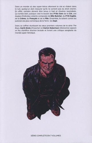 Dans un monde où des super-héros sillonnent le ciel et rôdent dans la nuit, quelqu'un doit s'assurer qu'ils ne sortent pas du droit chemin. En effet, certains doivent être tenus à l'oeil et d'autres neutralisés. Ca tombe bien, puisque c'est le boulot des P'tits Gars de la CIA, une équipe d'individus violents composée de Billy Butcher, du P'tit Hughie, de la Crème, du Français et de la Fille. Ensemble, ils luttent contre les justiciers les plus corrompus de la Terre : les Sept. Dans ce coffret réunissant les deux premiers volumes de la série The Boys, Garth Ennis (Preacher) et Darick Robertson (Wolverine) signent un feu d'artifice d'action brutale et livrent une critique sanglante du monde super-héroïque.