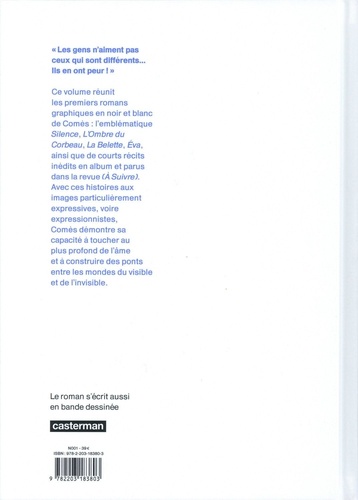 Cette compilation reprend les premiers romans graphiques en noir et blanc de Comès, dont l'emblématique Silence, portrait d'un simple d'esprit évoluant dans un village ardennais où la sorcellerie et les songes deviennent une réalité tangible. Suivent L'Ombre du Corbeau, une fable fantastique sur la vanité de la guerre, La Belette, autre grand récit ésotérique et rural, Eva, une troublante histoire mêlant sensualité, possession et folie, ainsi que de courts récits inédits en album et parus dans la revue (A suivre). Avec ces récits, Comès démontre sa capacité à toucher au plus profond de l'âme et à construire des ponts entre le monde du visible et de l'invisible.