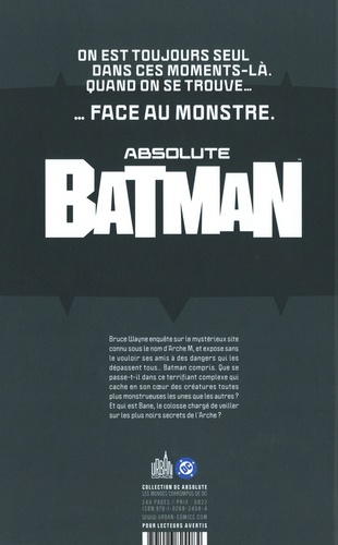 Bruce Wayne enquête sur le mystérieux site connu sous le nom d'Arche M, et confronte sans le vouloir ses amis face à des dangers qui les dépassent tous ? Batman compris. Que se passe-t-il dans ce terrifiant complexe qui cache en son coeur des créatures toutes plus monstrueuses les unes que les autres ? Et qui est Bane, le mystérieux colosse chargé de veiller sur les plus noirs secrets de l'Arche ? 9 ans après le succès retentissant de BATMAN - LA COUR DES HIBOUX, Scott SNYDER crée à nouveau l'événement en revenant par la grande porte chez DC pour imaginer une version plus brutale et, étonnamment, plus réaliste du protecteur de Gotham.