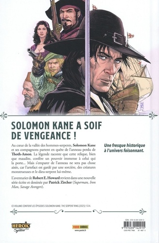 SOLOMON KANE A SOIF DE VENGEANCE ! Au coeur de la vallée des hommes-serpents, Solomon Kane et ses compagnons partent en quête de l'anneau perdu de Thoth-Amon. La légende raconte que cette relique, bien que maudite, confère un pouvoir immense à celui qui la porte... Mais s'emparer de l'anneau ne sera pas chose aisée, car l'artefact est gardé par une sorcière, des créatures monstrueuses et le dieu-serpent lui-même. L'aventurier de Robert E. Howard revient dans une nouvelle série écrite et dessinée par Patrick Zimher (Superman, Iran Man, Savage Avengers).