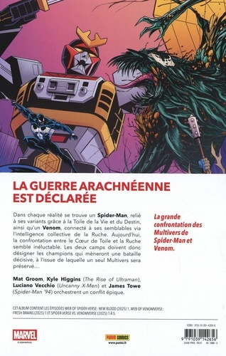La guerre arachnéenne est déclarée. Dans chaque réalité se trouve un Spider-Man, relié à ses variants grâce à la Toile de la Vie et du Destin, ainsi qu'un Venom, connecté à ses semblables via l'intelligence collective de la Ruche. Aujourd'hui, la confrontation entre le Coeur de Toile et la Ruche semble inéluctable. Les deux camps doivent donc désigner les champions qui mèneront une bataille décisive, à l'issue de laquelle un seul Multivers sera préservé... Mat Groom, Kyle Higgins (The Rise of Ultraman), Luciano Vecchio (Uncanny X-Men) et James Towe (Spider-Man '94) orchestrent un conflit épique. La grande confrontation des Multivers de Spider-Man et Venom.