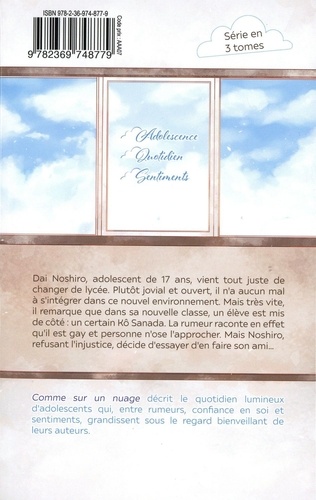 "Comme sur un nuage" décrit le quotidien lumineux d'adolescents qui, entre rumeurs, confiance en soi et sentiments, grandissent sous le regard bienveillant de leurs auteurs. Dai Noshiro, adolescent de 17 ans, vient de débarquer dans un nouveau lycée. Plutôt jovial et ouvert, il n'a aucun mal à s'intégrer dans ce nouvel environnement. Mais très vite, il remarque que dans sa nouvelle classe, un élève est mis de côté : un certain Kô Sanada. La rumeur raconte en effet qu'il est gay et personne n'ose l'approcher. Mais Noshiro, refusant l'injustice, décide d'essayer d'en faire son ami... - Aux USA, ce titre a été élu, lors de la prestigieuse Comic Con 2019, comme "Meilleur nouveau manga pour adolescents" (aux côtés de "L'atelier des Sorciers", "Beastars" et "Eclat(s) d'âme")
