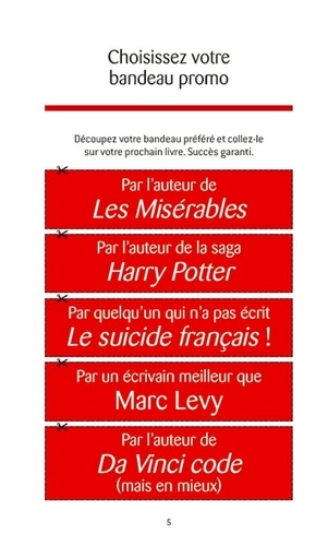 Et si c'était vrai ? Et si, vous aussi, vous deveniez l'auteur d'un best-seller traduit dans le monde entier, conquérant un lectorat fébrile à chacune de vos apparitions publiques ? Grâce à ce livre, c'est enfin possible ! Découvrez les techniques ancestrales de fabrication d'un best-seller et maîtrisez toutes les ficelles qui feront de vous le prochain numéro 1 des ventes. Identifiez votre genre de prédilection. Construisez une intrigue réussie avec des héros tourmentés comme des blogueuses mode et des chirurgiens-cosmonautes. Travaillez votre image et faites le buzz dans les médias ! N'attendez plus : investissez 6 euros dans cette méthode, vous en récolterez des millions !