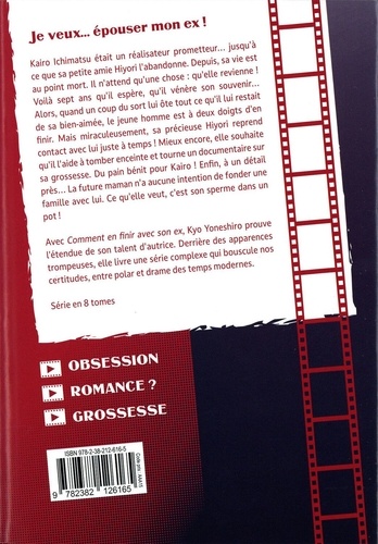 Avec Comment en finir avec son ex, Kyo Yoneshiro prouve l'étendue de son talent d'autrice. Derrière des apparences trompeuses, elle livre une série complexe qui bouscule nos certitudes, entre polar et drame des temps modernes. Kairo Ichimatsu était un réalisateur prometteur... jusqu'à ce que sa petite amie Hiyori l'abandonne. Depuis, sa vie est au point mort. Il n'attend qu'une chose : qu'elle revienne ! Voilà sept ans qu'il espère, qu'il vénère son souvenir... Alors quand un coup du sort lui ôte tout ce qu'il lui restait de sa bien-aimée, le jeune homme est à deux doigts d'en finir. Mais miraculeusement, sa précieuse Hiyori reprend contact avec lui juste à temps ! Mieux encore, elle souhaite qu'il l'aide à tomber enceinte et tourne un documentaire sur sa grossesse. Du pain bénit pour Kairo ! Enfin, à un détail près... La future maman n'a aucune intention de fonder une famille avec lui. Ce qu'elle veut, c'est son sperme dans un pot.