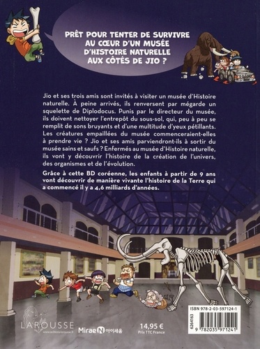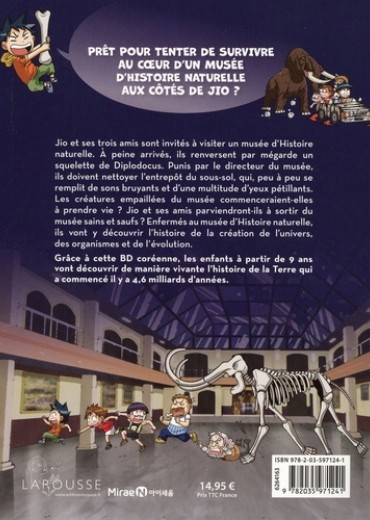 Géo, qui est invité à visiter un musée d'Histoires Naturelles, s'y rend avec ses trois amis, Myeongsu, Miki et Geumbo. A peine arrivés, Géo et ses amis renversent un squelette de Diplodocus. Punis, ils doivent nettoyer l'entrepôt du sous-sol du musée, qui, peu à peu se remplit de sons bruyants et d'une multitude d'yeux pétillants. Les créatures empaillées du musée commenceraient-elles à reprendre vie ? Géo et ses amis parviendront-ils à sortir du musée sains et saufs ? Enfermés au musée d'Histoires Naturelles, Géo et ses amis vont y découvrir l'histoire de la Terre, ainsi que celle de la création de l'univers, des organismes et de l'évolution de l'humanité. En explorant les salles liées à la création de la Terre, à l'ère paléozoïque et à l'humanité, les jeunes lecteurs vont découvrir de manière vivante l'histoire de la Terre qui a commencé il y a 4, 6 milliards d'années.