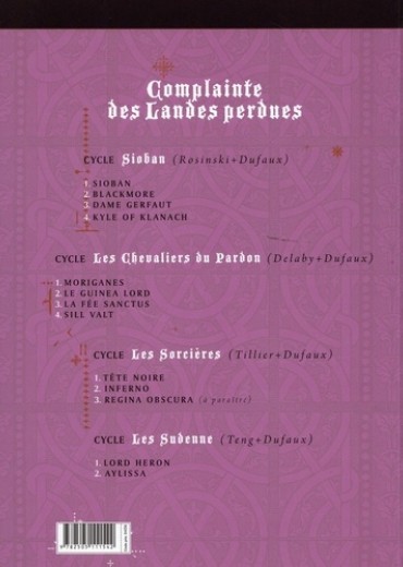 Sobold est mort subitement. Il était le chef du clan des Greenwald et le mari d'Aylissa, la cousine de Sioban. Ses hommes sont en colère. Ils ne s'expliquent pas ce décès brutal. Il faudra toute la force de persuasion de Sioban pour les rappeler à leur devoir de fidélité vis-vis des Sudenne. Cette force, elle en aura aussi besoin pour atteindre son objectif : garantir la paix entre les clans, malgré leurs divergences. Aylissa, aussi perfide que séductrice, ne partage pas cette vision. A ses yeux, seul le pouvoir compte. Et tous les moyens sont bons pour l'obtenir. Bientôt, les événements se précipitent. Les Sacrifiés, venus des terres pourpres au-delà des landes perdues, s'apprêtent à attaquer. L'affrontement est inéluctable. Sioban devra triompher, tout comme elle devra triompher du piège du Mal, tapi en elle et toujours prêt à resurgir... Dans ce deuxième tome du quatrième cycle de La Complainte des landes perdues, Jean Dufaux et Paul Teng composent une fresque ambitieuse, entre scènes d'action spectaculaires et exploration de la psychologie, parfois tortueuse, des personnages de cette saga haute en couleur.