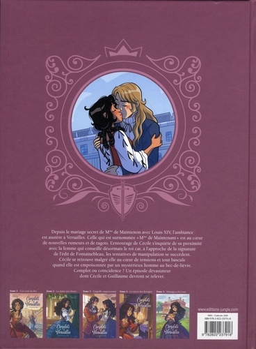 Complots autour de Mme de Maintenon, la sorcière, comme l'appelle La Palatine, serait à l'origine de tous les maux qui frappent la cour et la France. Au coeur des tensions, le conflit entre chrétiens et protestants et la volonté politique de n'avoir qu'une seule religion pour le pays. Les conversions de force, les dragonnades plongent le pays dans une ambiance troublée et propice aux complots. Cécile va encore une fois se retrouver au coeur de ces complots qu'elle va tenter de déjouer avec son mari. Malheureusement, cette fois-ci elle n'en ressortira pas indemne : elle va perdre un bébé. Et c'est en aidant Pauline à donner la vie à son premier enfant que Cécile va parvenir à remonter la pente et à retrouver toute son énergie d'antan.